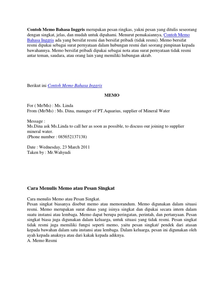 Pesan singkat dapat juga dikirim melalui memo. Maafkan aku, aku tidak bisa kerumahmu untuk mengerjakan tugas bahasa inggris siang ini. Jadi dapat disimpulkan bahwa pengertian memorandum adalah sebuah pesan singkat, padat, dan jelas yang ditujukan kepada departemen atau divisi di dalam satu perusahaan, yang inti pesannya berupa perintah, pemberitahuan, arahan, permohonan, atau permintaan. Mr.lukito is a manager in a company located in semarang. Sesuai judul, contohmemo bahasa inggris dari cobi berisiklan pesan yang ada di sekolah. 5 format penulisan business letter atau 3 contoh inquiry letter atau surat permintaan dalam bahasa inggris terbaru beserta arti. Contoh di atas merupakan contoh pesan singkat yang dikirim menggunakan sms, contoh ini bisa dikirim secara personal, bisa juga secara massal. Bila sekolah memiliki akses massal untuk menyebarkan pengumuman pada seluruh guru maka pengumumanya bisa berbeda. Pengertian, jenis, bagian, fungsi, cara membuat dan contoh memo. Sorry, i have to go to work very early. Terdapat dua jenis memo, yaitu memo resmi dan memo tidak resmi. Sesuai dengan fungsinya, pesan singkat bentuknya pendek serta berisi informasi ringkas dan jelas. Bahasa pesan singkat atau sms mungkin tampaknya membuat teks menjadi sederhana atau lebih cepat diketik namun ada beberapa pengguna yang masih bingung menggunakannya karena belum terbiasa.