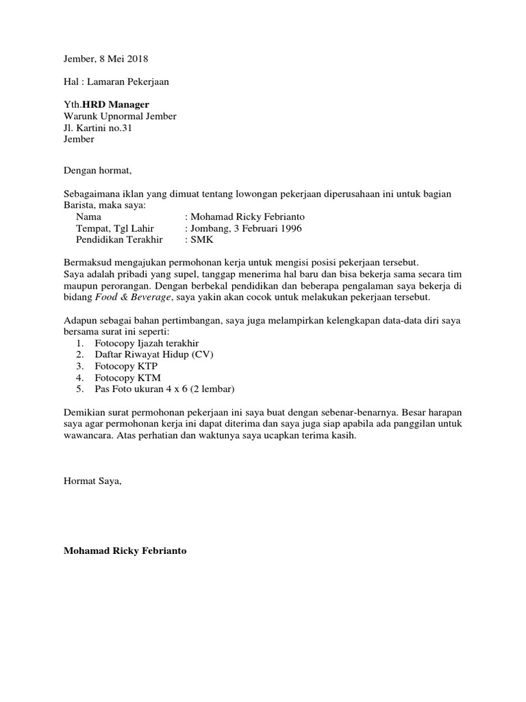 Dengan hormat, berdasarkan informasi dari harian bisnis tertanggal 20 september 2018 tentang adanya lowongan pekerjaan di pabrik roti swiss yang bapak/ibu pimpin. Tuliskan juga nilai apa yang anda miliki. Jika secara cermat kita perhatikan, memang surat lamaran yang diketik memberikan hasil terbaik dari segi namun demikian, tetap saja surat lamaran kerja tulis tangan memberikan nilai lebih dan menjadi daya tarik sebagian besar hrd atau tim seleksi. Demikianlah surat lamaran permohonan pekerjaan yang saya ajukan. Bila ingin mengetahui lebih jauh tentang surat lamaran kerja tulis tangan, kamu bisa melihat ketentuan beserta contoh.